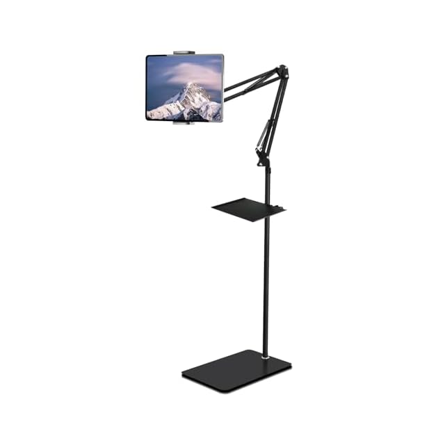 【小物置き付き タブレットスタンド】寝室での動画鑑賞、YouTubeを見て、在宅勤務、オンライン授業など、どんな場所でもご好みのように使用可能です。小物置きも付属し、耐荷重は1.5kg、モバイルバッテリー、イヤフォン、ゲームハンドル、コーヒー、おやつなど置けることができます。小物置きは支柱の任意位置にネジで簡単に固定でき、不用の時に取り外して良いです。本タブレットスタンドは貴方の両手を完全に解放させ、ベッドに寝ながらリラック時間を楽しめます。