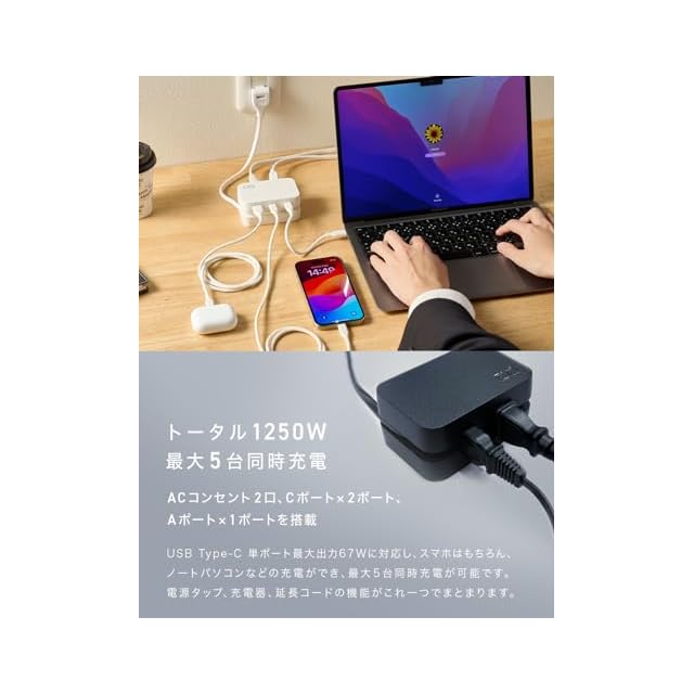 【USB付き電源タップ】AC100V電源タップ2口、USB-Cを2ポート・USB-Aを1ポート搭載。5台まで様々なデバイスを同時充電できる延長コード付き電源タップです。これがあるだけで、スマホやノートPCなどの充電器を別々に用意する必要が無くなります。ACプラグのみ使用時は合計1250W、USBポートを併用時は合計1125Wの出力に対応し、USB-C単ポート最大67W出力に対応。ノートパソコン、スマートフォン、タブレット、イヤホン、スマートウォッチ、カメラ、NintendoSwitchなどのゲーム機の充電にも適しています。