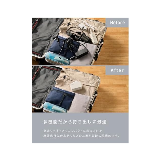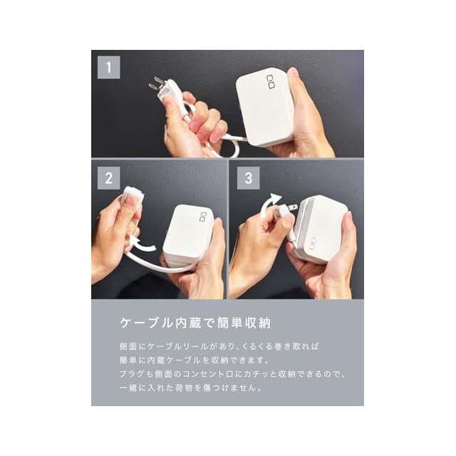 【ケーブル内蔵で簡単収納】側面にケーブルを収納する溝があり、くるくると巻き取ることで簡単にまとめることができます。持ち運び時の携帯性や使用シーン、収納のしやすさからケーブルの長さを約50cm(55cm)、スイングプラグを採用。必要分だけ巻き取ればケーブルが邪魔になりにくく、スイングプラグは使いづらい位置のコンセントにも対応しやすいので、カフェや自宅の卓上はもちろん、旅行先のホテルのデスクや新幹線でも使いやすく延長コードとしてお使いいただけます。