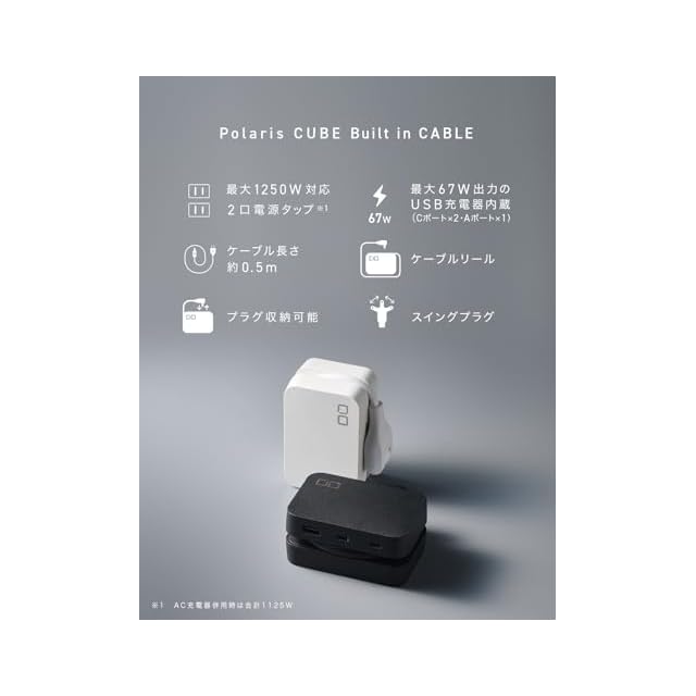 CIO 電源タップ USB付 Polaris CUBE Built in CABLE 卓上 旅行 持ち運び 延長コード 0.5m 収納リール付 合計5口 Type-C Type-A AC差込口 小型 急速充電 iPhone 17 / 16 / 15 Android Macbook iPad Galaxy その他対応(ホワイト) | つむぎ屋