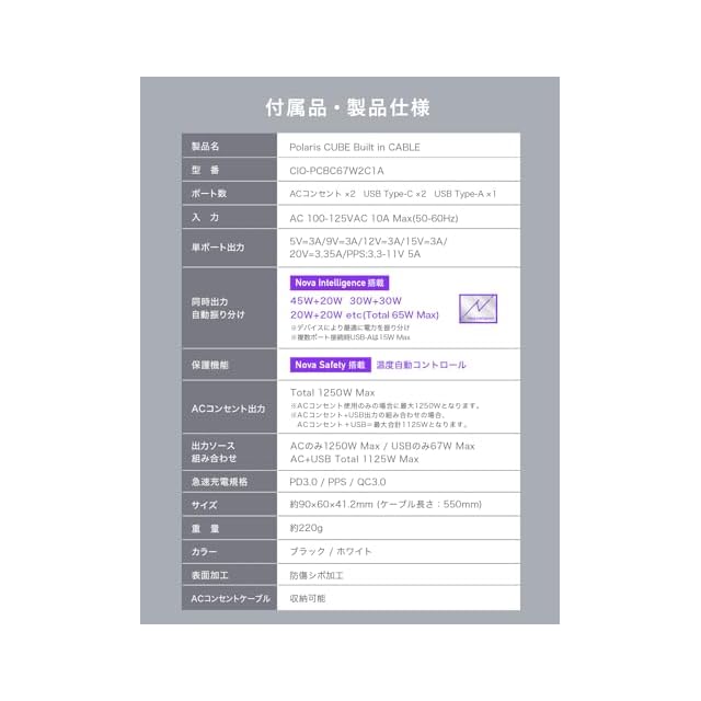 【安全機能 独自技術NovaSafety搭載】ポラリスキューブ ビルトインケーブルをより安心して長くご使用いただきたい。そうした想いからCIO独自技術『NovaSafety』を搭載。製品温度を常に監視し、製品高負荷時に自動的に電力調整を行います。