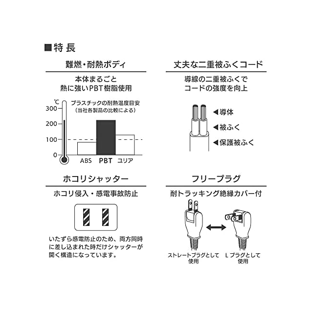 【 特 長 】 ◆本体まるごと熱に強いPBT樹脂使用 ◆導線の二重被ふくでコードの強度を向上 ◆ホコリシャッターでホコリ侵入・感電事故防止 ◆耐トラッキング絶縁カバー付きフリープラグ ◆本体カラーはホワイト【 仕 様 】 ◆最大消費電力 合計:1500W ◆コンセント:3個口 ◆プラグ形状:フリープラグ ◆コード長:3m