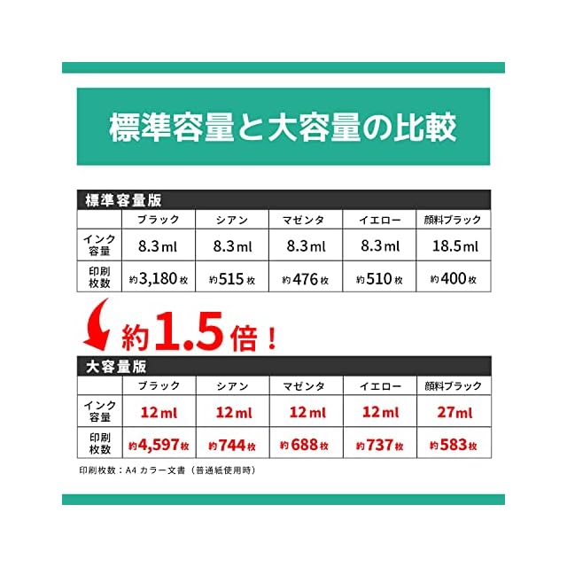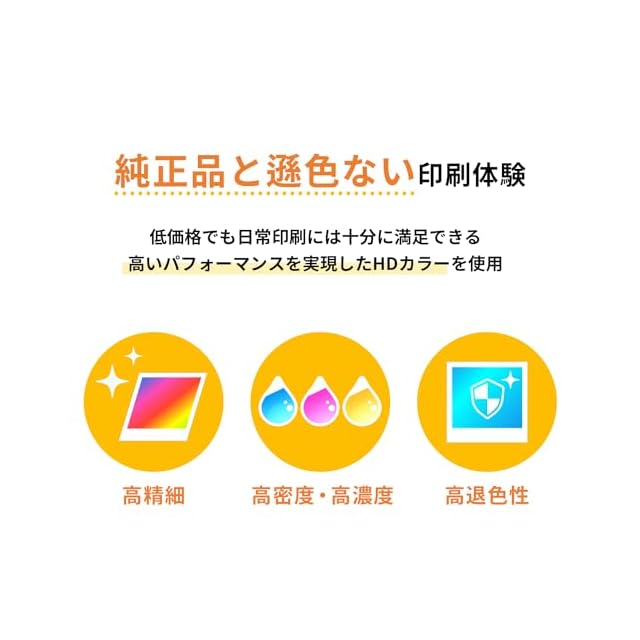 [商品説明] ・本製品は、純正品と同様に使用できる互換インクカートリッジです。メーカー純正品ではありません。・インクには、流動性が高く発色の良い「HDカラー」を採用しています。プリントヘッドにやさしく、プリンタの寿命を縮めることはありません。・互換インクとプリンタの相性問題の原因となる「ICチップ」は、業界最大手のAPEX(アペックス)社製の最新バージョンのICチップを採用し、高い安定性を実現しています。・高性能ICチップと高品質インクを採用していますので、純正インクとの併用が可能です。・残量表示にも対応しておりますので、プリンタの設定変更をすることなく、純正品と同様にお使いいただけます。・プリンター故障の原因になるカラ打ちを防止するために、印刷枚数に必要なインクよりも多めにインクが填充されています。そのため、使用後にカートリッジ内にインクが残っている場合がありますが製品不良ではありません。