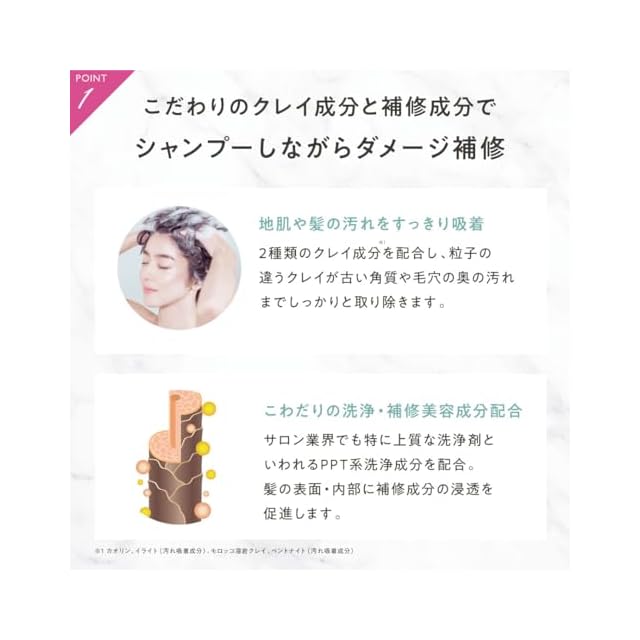 【優しく洗う】モロッコ溶岩クレイ由来のミネラルクレイとピンククレイのWクレイ処方で毛穴の奥と頭皮表面をの汚れを吸着
