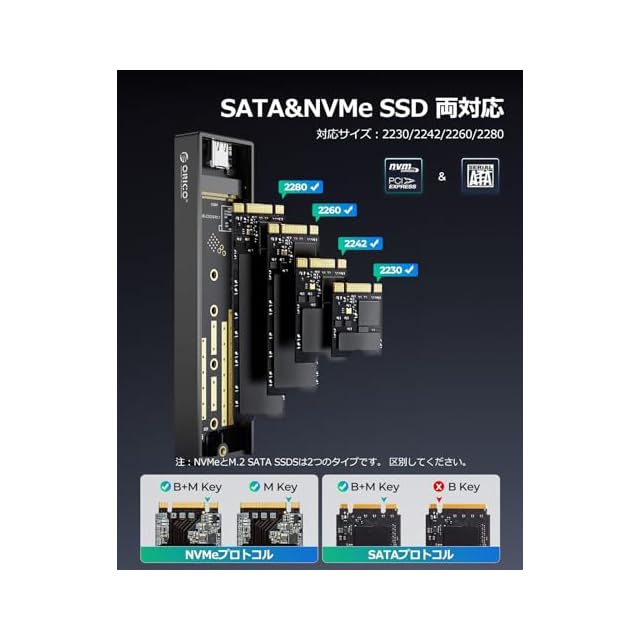【強力な互換性】 SSD 外付けケース筐体は、M.2 NVMe M Key/B+M KeyおよびM.2 NGFF SATA B+M Key SSD (SATAベース)に適しています。 SSDの最大容量は8TB.SSDサイズ:2230/2242/2260/2280.複数のオペレーティングシステムと互換性があります:Windows、Mac OS、Linux、Android.この製品はM.2 PCIe AHCI/B Key SATA/mSATA SSDとは互換性がありませんのでご注意ください。