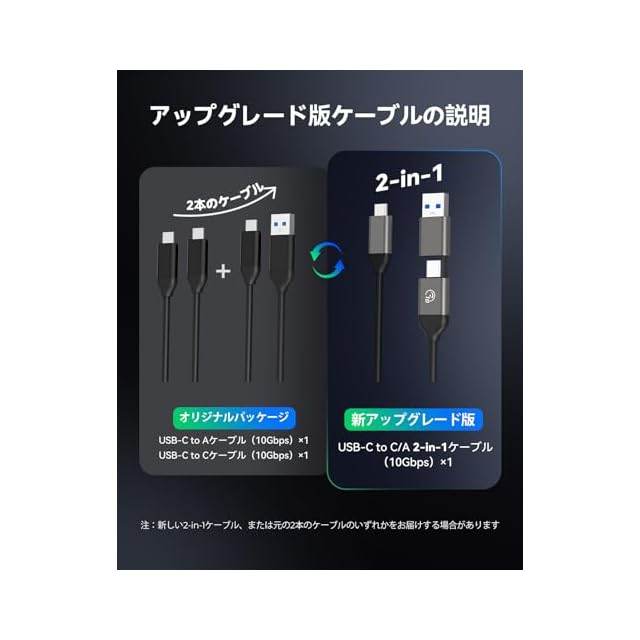 【ケーブル設計の改良】究極の利便性を提供するため、本NVMeエンクロージャーには従来とは異なる新設計の2-in-1データケーブル(USB-C to C + USB-C to A)が同梱される場合があります。どちらか1本がランダムで付属し、いずれも高速データ転送と充電に対応しています。