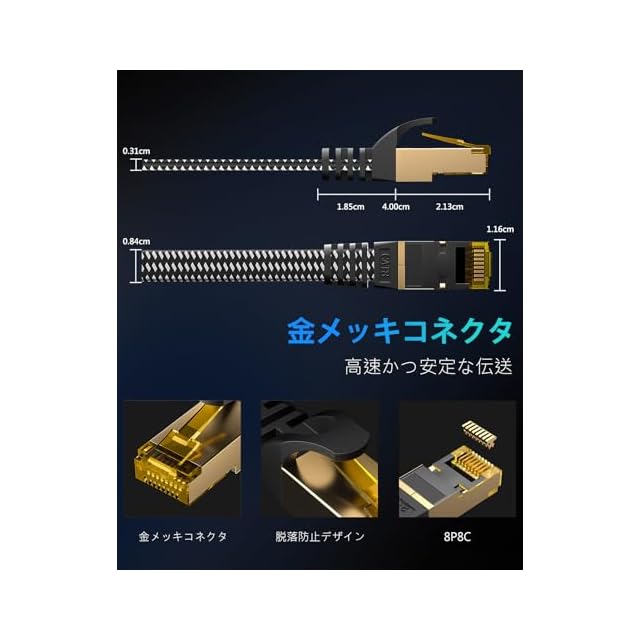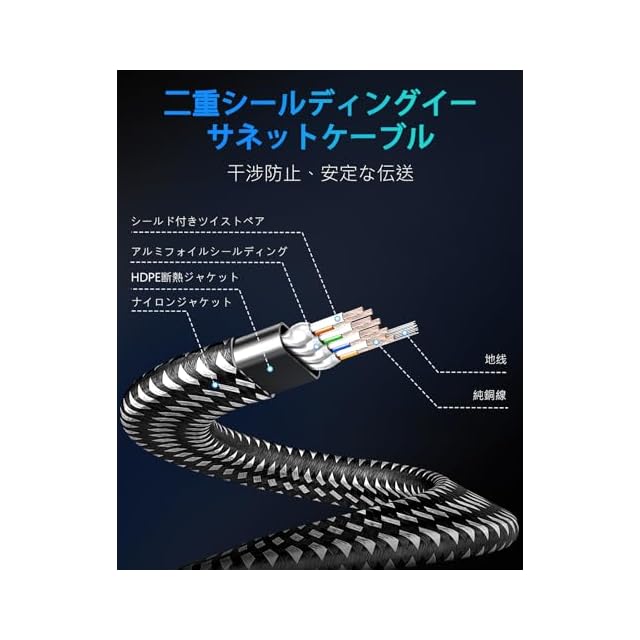 ユニバーサルRJ45コネクタ:両端コネクタ付(8芯 鍍金RJ45 スリムコネクタ採用)。内蔵100%裸銅線(シールドケーブル)。ツメ折れ防止カバー、曲げても折れない。ノイズ干渉も強い、高速で安定した。な難燃性、耐久性、耐候性