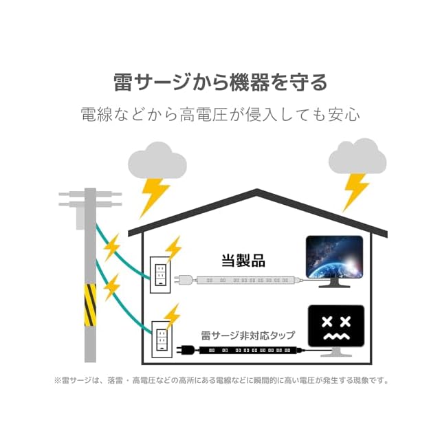 コンセントから進入する12500V(JEC210/212規格に基づく数値)までの誘導雷による雷サージから接続機器を保護する雷ガード機能を搭載しています。※受けた電圧や回数により性能は劣化します。