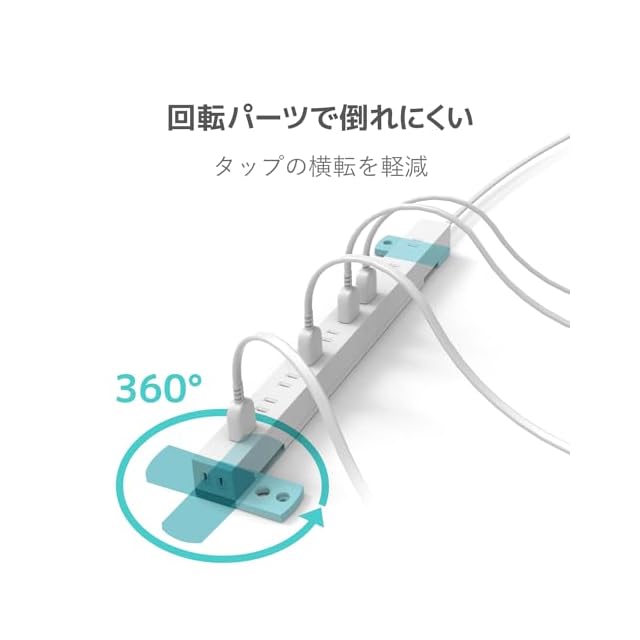 360度回転可能な脚パーツは展開することで、重いACアダプターなどを接続してもタップが横転しにくくなります。