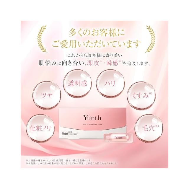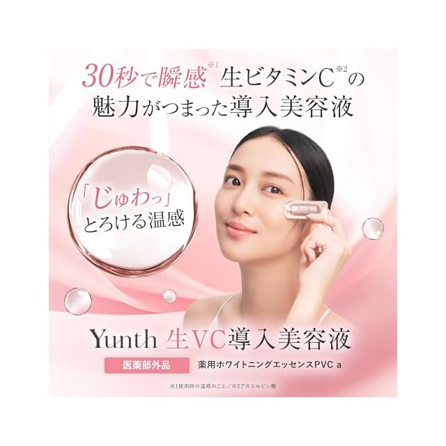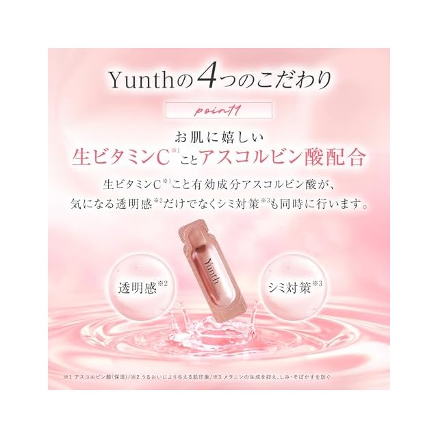 雑誌掲載多数。ananモテコスメ受賞。 Yunthの大人気商品「生ビタミンC美白美容液」美白有効成分アスコルビン酸が透明感のある肌へと導きます。