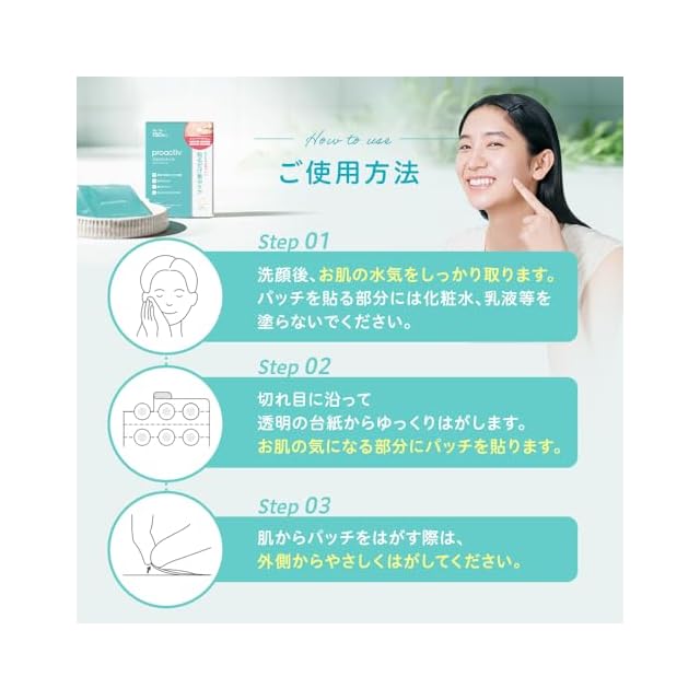 【使用方法】1.洗顔後、お肌の水気をしっかり取ります。パッチを貼る部分には化粧水、乳液等を塗らないでください。2.切れ目に沿って透明の台紙からゆっくりはがします。お肌の気になる部分にパッチを貼ります。3.肌からパッチをはがす際は外側からやさしくはがしてください。