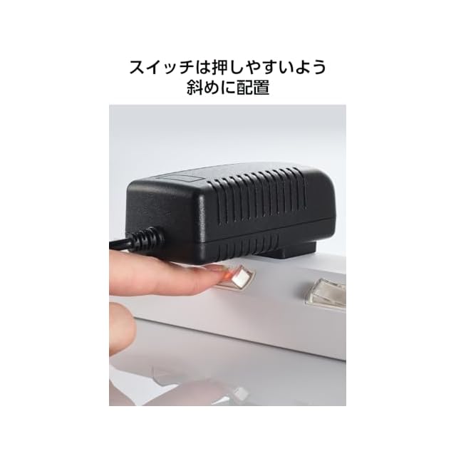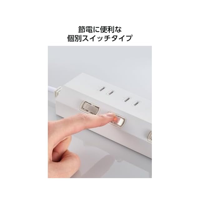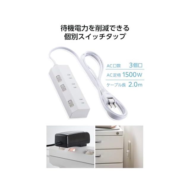 オフィスやご自宅などの、さまざまなシーンで使いやすい3個口タップです。個別スイッチで差込口ごとに、電源のON/OFFの切り替えができます。接続機器の電源がOFFの状態でも電力を消費する待機電力を削減し、電気代の節約に役立ちます。また、使用しない機器の電源管理もしやすくなります。
