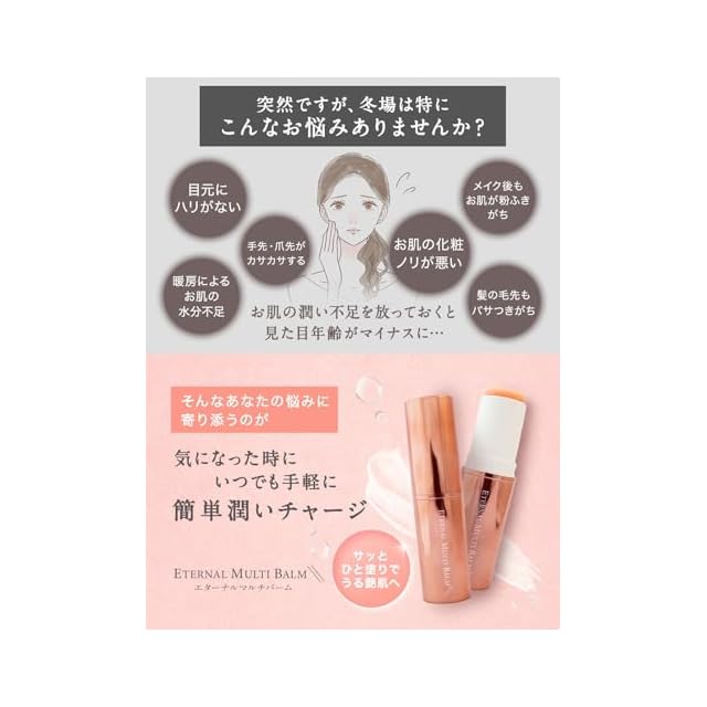 ✅【今話題の携帯出来る美容液】スティック状の美容液なので外出先でも使用可能エターナルマルチバームは、目元 口元 首 潤い ハリ 乾燥 などの気になる部分へさっと使用できるマルチバーム。韓国で製造をしている本格 韓国コスメ です