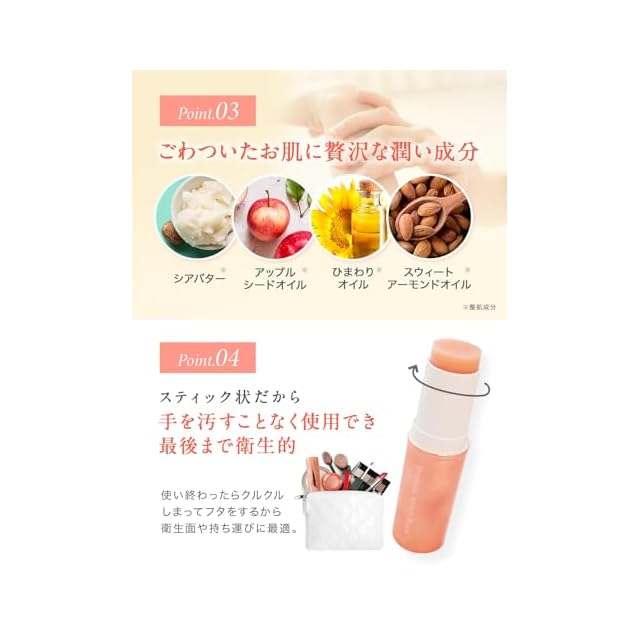 ✅【1本で10役!保湿と潤いのダブルケア】気になる年齢サイン対策 髪の毛先 首元 かかと 両肘 手先 指先 フェイス周り 唇 の乾燥対策 ハイライト効果(艶出し) メイク直し いつでもどこでも潤いチャージバームを1~2mm繰り出し、目元、ほうれい線、フェイスラインなどの気になる部分に当てて軽くスライドしてください。