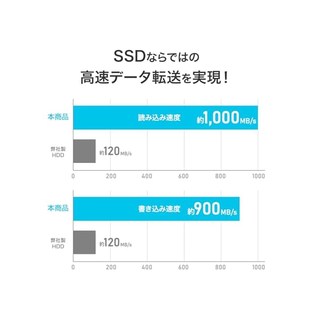 【SSDならではの高速データ転送を実現!】最大転送速度は、読み込み約1,000MB/s、書き込み約900MB/sで、高速なデータ転送を実現しました。大容量の動画や写真データも快適に扱えます。