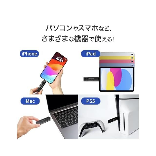 【パソコンやスマホなど、さまざまな機器で使える!】USB-A&USB-C対応で、exFAT形式でフォーマット済みです。パソコン、スマホ、タブレットなど異なるデバイス間のデータ移動もかんたんで、挿してそのまますぐに使えます。