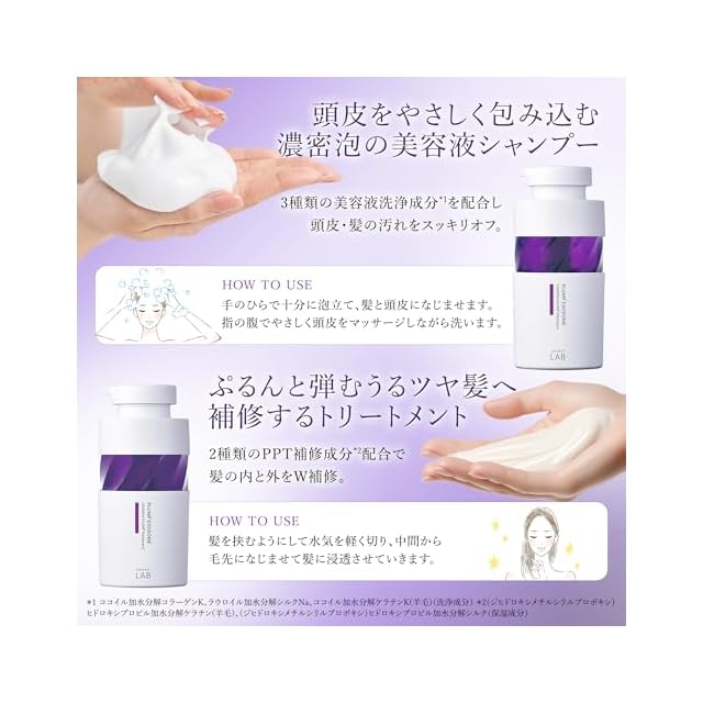 超高圧※1浸透型ハイドロコラーゲン配合※2の濃密泡で乾燥・パサつき髪を修復。 洗うたびにパサついた髪にうるおいを与え毛先までしっとりぷるぷる髪へ導く集中美容液シャンプー。