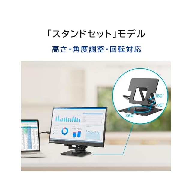【高さ・角度調整・回転対応の「スタンドセット」モデル】モバイルディスプレイ単体に加えて、スタンドがセットされたモデルもラインアップ。セットモデルは利用シーンに合わせてお好みの高さ・角度に調整、回転ができるスタンドが標準で添付されています。もちろん、モバイルディスプレイ単体でも本体背面に自立スタンドが付いているため、外出先でもコンパクトにマルチディスプレイ環境を作ることができます。