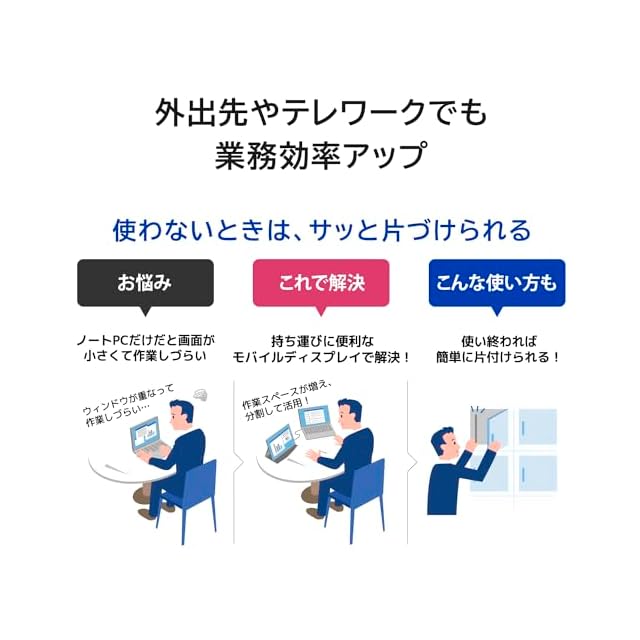 【これ1台あれば、在宅勤務やモバイルワークでも業務効率アップ! 】在宅勤務や外出先でノートパソコンさえあれば、仕事はできるが画面が小さいためどうしても業務の効率が上がらないと感じている方におすすめです。コンパクトながらもフルHDの解像度があるので、これ1台をつなぐだけで、作業領域が広がるので業務効率がアップします。また、使い終われば、サッと片づけられ場所もとりません。