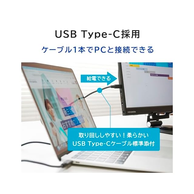 【USB Type-C採用!ケーブル1本でPCと接続できる!】USB Type-Cディスプレイ給電に対応。添付しているUSB Type-Cケーブルで接続することにより、パソコンからの映像出力と給電がケーブル1本で行われます。 従来品よりも柔らかいUSB Type-Cケーブルを採用、配線の取り回しがしやすく、収納時はコンパクトにまとめやすいです。