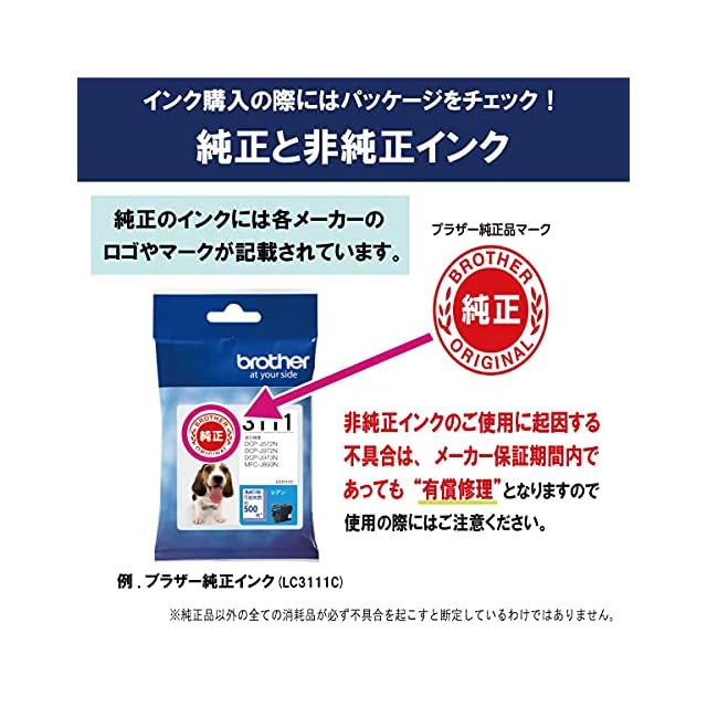 ブラザー純正インクは製品本体の性能を十分に発揮するために研究を重ね、開発されています。非純正インクをお使いになりますと製品本体の性能を十分に発揮できないだけでなく製品本体を損傷させる可能性がありますのでご注意ください。