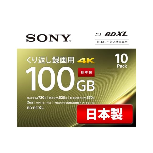 ソニー 日本製 ブルーレイディスク BD-RE XL 100GB (1枚あたり地デジ約12時間) 繰り返し録画用 10枚入り 2倍速ダビング対応 ケース付属 10BNE3VEPS2