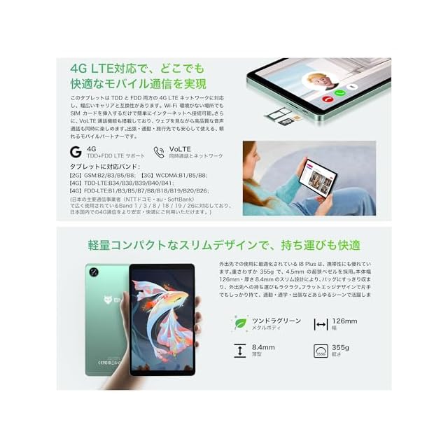 【タブレット 8インチ wi-fiモデル & 4G LTE通信対応 & Bluetooth5.2】この4G LTE通信可能タブレットは、デュアルSIMを備え、事業用とプライベート用のSIM カードを同時に利用でき、切り替えることなく柔軟に通信を行えます。デュアルバンド2.4G/5G WIFIもサポートしており、高速で安定した無線接続を実現し、ダウンロードやアップロード速度が向上します。更に、GPS、Beidou、Galileo、Glonassの4大衛星システムに対応し、ルート検索や位置情報サービスを快適に利用できます。BT 5.2も搭載し、ワイヤレスイヤホンとの接続遅延を最大75%低減し、ゲーム実況時の音声ズレや動画編集時の音声同期の問題を解消します。サポートバンド:【2G】GSM: B2/B3/B5/B8;【3G】WCDMA: B1/B5/B8;【4G】TDD-LTE: B34/B38/B39/B40/B41;【4G】FDD-LTE: B1/B3/B5/B7/B8/B18/B19/B20/B26