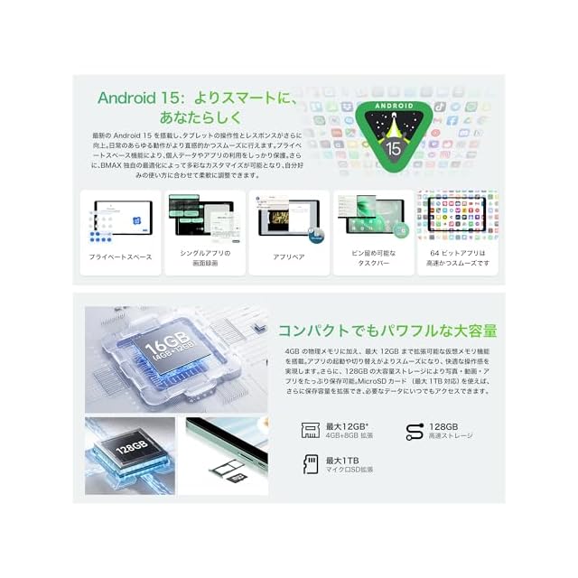 【Android 15 タブレット 8インチ初登場】Bmax I8 Plus 8インチ タブレットは最新Android15 OSを搭載し、64ビットAPPアプリケーションに深く最適化され、起動と応答速度が向上しています。 また、弊社の二次開発では、システムUIの一部が改善・最適化され、より多くのサードパーティ製アプリケーションに適応し、システムインタラクションがよりフレンドリーで便利になりました。プライベートスペース:機密性の高いアプリやデータを見えないようにします。アプリのペア:最もよく使用するアプリをペアリングすることで、タップでマルチタスクを実行します。また、単一アプリの画面録画、16GBメモリーページング・サポートなど、他のアンドロイド15の新機能も搭載している。アンドロイド15タブレットI8 PLUSは、自信を持って探索し、道を発見するのに役立つ新機能を提供しています。