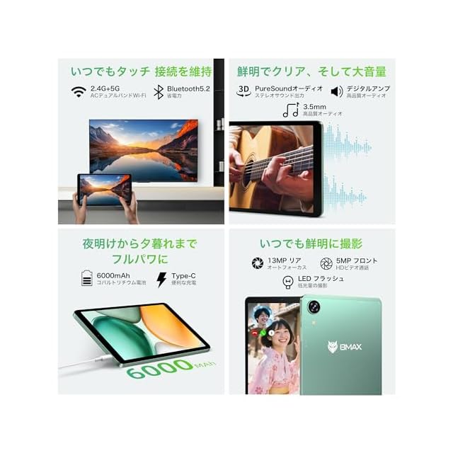 【多機能タブレット機能 & 画面分割 & FMラジオ & 児童守護 & OTG】BMAX アンドロイド タブレットは、USB Type-C +独立した3.5mmのヘッドフォンジャックを備え、充電や音楽を聴くときに互いに干渉せず、お気に入りのヘッドフォンやヘッドセットを接続し、いつでもどこでも、より臨場感のある音楽や好きなFMラジオを聴くことができます、さまざまなニーズに応えます。OTG対応で外部デバイスとの連携で写真・動画・ファイルなどの転送できます。更に、画面上に2つのアプリを同時に表示する「画面分割」機能が備わって、YouTubeで動画を見ながらTwitterを見ます。その他、お子様がタブレットを使用する量を制御するのに役立ち、お子様が適切に学習し、楽しむのに役立つ便利な方法を保護者に提供します。タブレットに学習と娯楽のより良いバランスを持たせる。