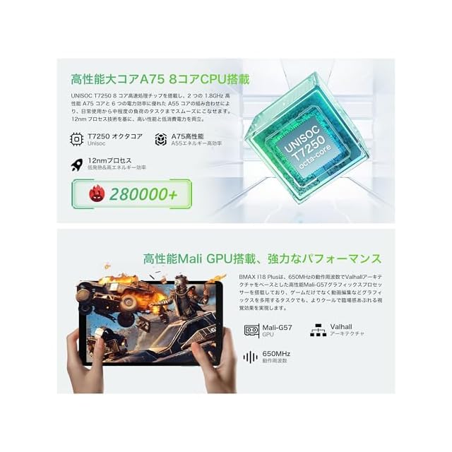 【16GB+128GB+1TB拡張 & 高性能T7250 8コアCPU & Mali G57 GPU】このアンドロイド15 タブレットは 16GBメモリ(4+12仮想)RAMは、ゲームやビデオ、電子書籍などあらゆるアプリの快適な動作をサポートします。128GBの内蔵ROMストレージは、日常のニーズに応える。SDカードスロットで1TBまで簡単に拡張でき、電子書籍やビデオ、ゲームのダウンロードに余裕があります。更に、BMAX I8 Plus タブレットはUnisoc T7250オクタコアチップを採用しており、スマートオフィス、効率的な学習、映像エンターテインメントなど、あらゆるシーンに対応できます。2つの大型コア[email protected]と6つのA55のスマートAIチップを搭載し、高速な演算速度を実現しています。アンドロイド15 タブレット 8インチに搭載されたMali-G57 GPUは、インテリジェントなアルゴリズムにより、ディスプレイの色やディテールを強化し、ゲームや詳細な動画再生において、より一層美しいビジュアルを実現します。