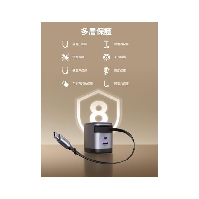 ▶【長持ちするためのデザイン】UGREEN 65W 伸縮シリーズには進化した GaNFast チップを採用。UGREEN独自の Thermal Guard温度制御技術との組み合わせにより、エネルギー効率を向上、機器本体の発熱量を軽減しました。8 層からなる安全保護機能も備えています。乱雑に扱っても、熱暴走しても、ずっと安心。愛用ガジェットを守りながら、何年も使い続けられる本物の耐久性能です。