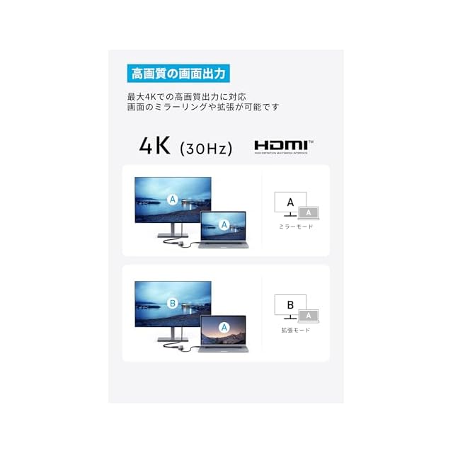 高画質の画面出力:HDMIポートを使用して、最大4K (30Hz)の鮮明な画像出力が可能です。