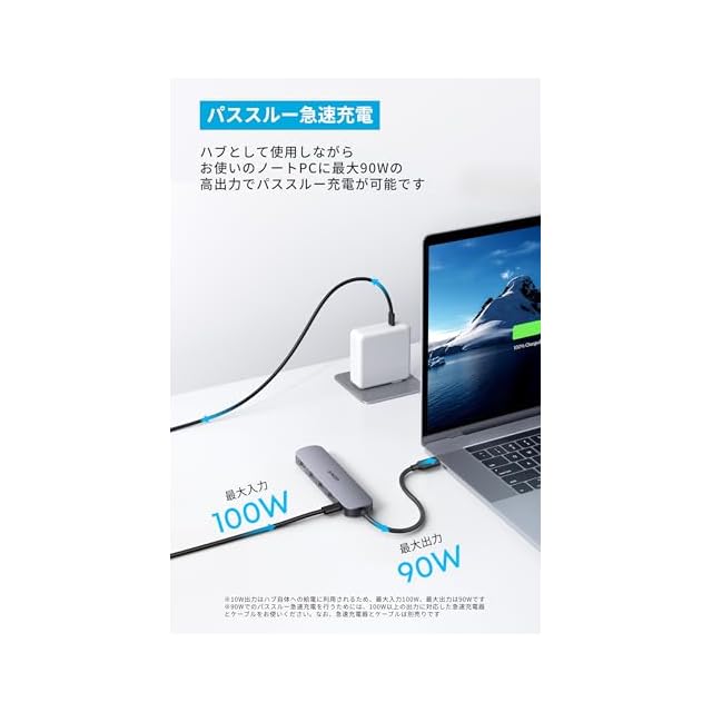 パススルー急速充電:ハブとして使用しながらお使いのノートPCに最大90Wまでの高出力でパススルー充電が可能です。(※90Wでのパススルー急速充電を行うためには、100W出力に対応した急速充電器とケーブルをお使いください。なお、急速充電器とケーブルは別売りです)