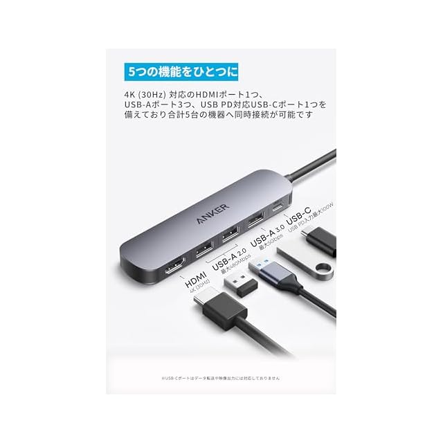 商品名:Anker USB-C ハブ (5-in-1, 4K, HDMI) グレー 100W USB PD対応 4K HDMIポート5Gbps 高速データ転送 USB-C/USB-Aポート搭載