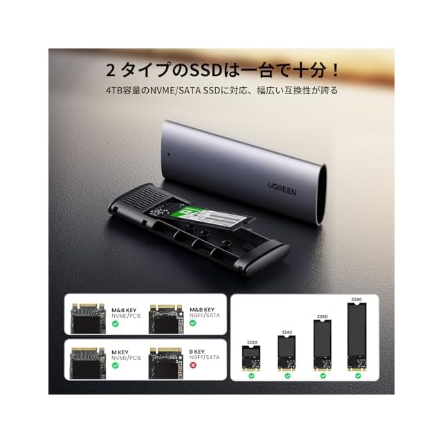 商品名:UGREEN M.2 SSD 外付けケース-SATA NVME両対応 M.2 SSD ケース USB3.2 Gen2接続 UASP対応 10Gbps高速転送 アルミ ssd m.2 ケース 2230/2242/2260/2280 M key/B+M key SSD対応 シリコンラバー付き 【USB A-C&USB C-C 2本ケーブル付き】