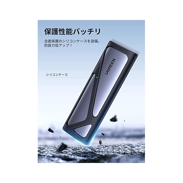 【SSD 外付けケースをバッチリ防御】UGREEN このM.2 SSD 外付けケースは緩衝材としてシリコンラバーを付属しているので、外部からの衝撃を大幅に消散。デスク上で滑ったりせずSSDをしっかり保護します。又は僅か119 x 37 x 12 mmのコンパクトサイズで、海外へ出張や自宅・職場・旅行など、様々な場所への携帯にも便利です。