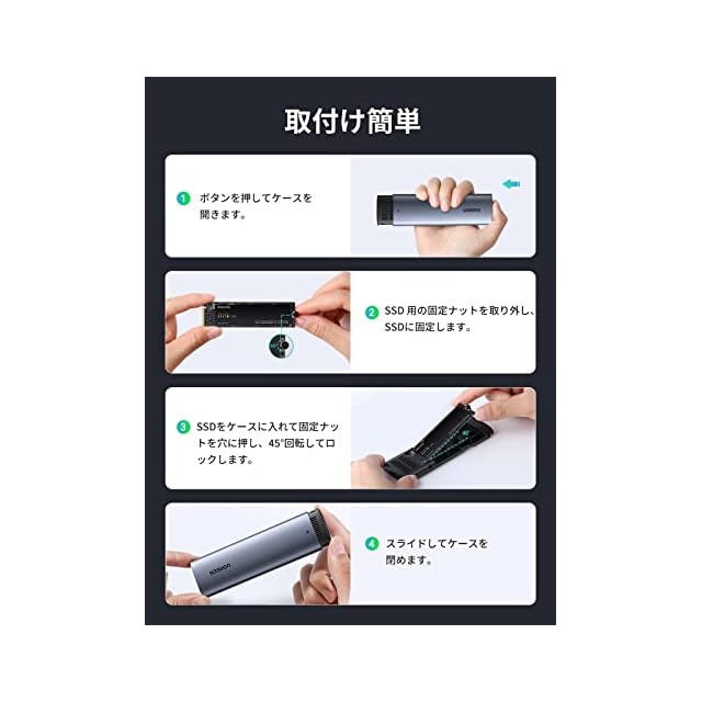 【工具不要・使い勝手が抜群】ロック付きの引き出し式デザインを採用したこのM.2 SSD 外付けケースはネジ・工具不要、たったの3ステップで手軽にSSDを出し入れ可能。SSDの装着方法は、ゴム留めを使います。先にSSD側へゴム留めを差し込んでから押し込む手順になりますので、ご注意ください。又はSSDの装着は必ずSSD端子部分が完全に隠れてください。