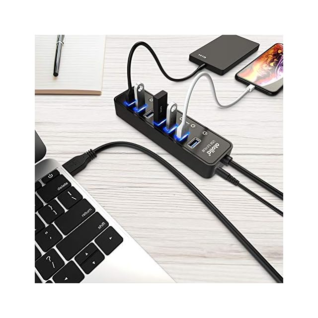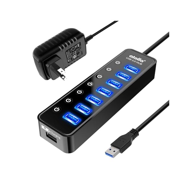 USB ハブ atolla USB 3.0 Hub 7ポート増設 + 1充電ポート, USB拡張 セルフパワー/バスパワー 【USB Hub 独立スイッチ付・5V/4A ACアダプタ付き・100cmケーブル】