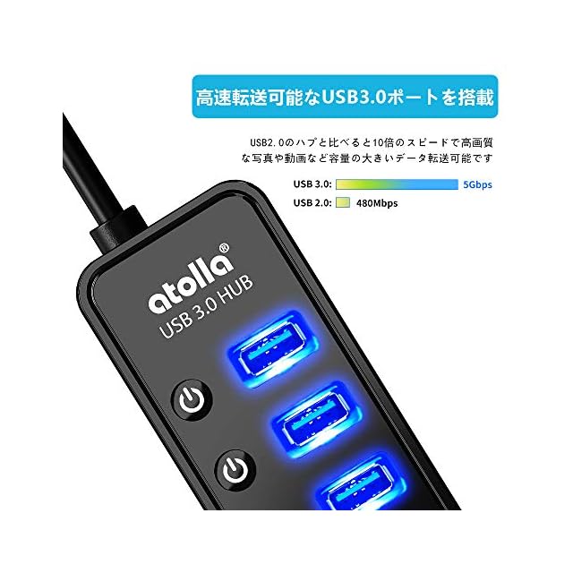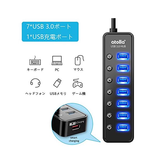 商品名:USB ハブ atolla USB 3.0 Hub 7ポート増設 + 1充電ポート, USB拡張 セルフパワー/バスパワー 【独立スイッチ付・5V/4A ACアダプタ付き・100cm USBケーブル】