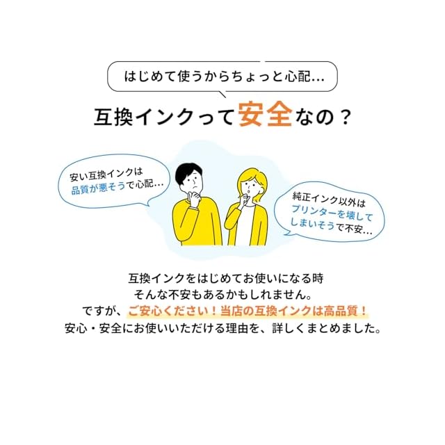 [日本人技術者監修] ・当社熟練の日本人技術者による品質改良・アフターサポートが充実! ・ISO14001、ISO9001を取得した工場で生産された商品です。 ・品質を保持するため、インクはひとつずつ個包装をしております。 ・改善が必要とされる場合は、当社の担当スタッフより海外提携工場と直接やり取りを行っております。連携を密にとり、品質の維持や向上に努めております。・純正インクから互換インクに切り替えた最初のうちは、それぞれのインクが混ざり合う為に印刷にかすれが出ることがあります。その場合は、通常よりも多めにヘッドクリーニングをおこなってください。