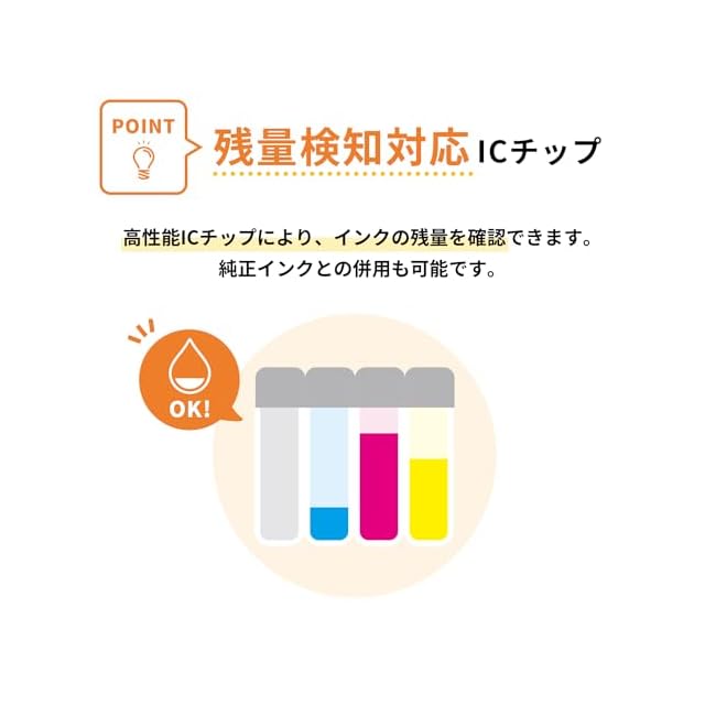 [商品説明] ・本製品は、純正品と同様に使用できる互換インクカートリッジです。メーカー純正品ではありません。・インクには、流動性が高く発色の良い「HDカラー」を採用しています。プリントヘッドにやさしく、プリンタの寿命を縮めることはありません。・互換インクとプリンタの相性問題の原因となる「ICチップ」は、業界最大手のAPEX(アペックス)社製の最新バージョンのICチップを採用し、高い安定性を実現しています。・高性能ICチップと高品質インクを採用していますので、純正インクとの併用が可能です。・残量表示にも対応しておりますので、プリンタの設定変更をすることなく、純正品と同様にお使いいただけます。・プリンター故障の原因になるカラ打ちを防止するために、印刷枚数に必要なインクよりも多めにインクが填充されています。そのため、使用後にカートリッジ内にインクが残っている場合がありますが製品不良ではありません。