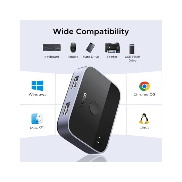 【幅広い互換性とドライバ不要】: UGREEN USB切り替え機は、Windows、macOS、Chrome OS、Linuxコンピュータ用のプラグ&プレイです。プラグインするだけで、効率的な作業を楽しむことができます。