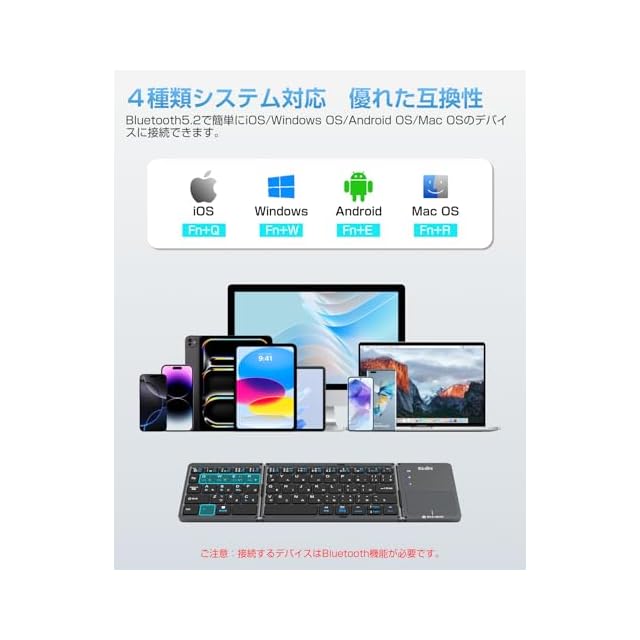 【四つOS対応 、広がる汎用性】 折りたたみキーボードは、 iOS/Windows/Android/MacOSの主要OSに対応。bluetooth キーボードは、Bluetooth 5.2でスマホ(iPhone/Android)、タブレット(iPad各種)、PC(Windows/Mac)など、様々なデバイスにワイヤレス接続可能。