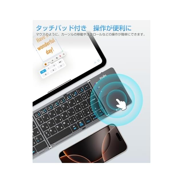 【4OS対応 & 広範囲接続】 ヨドバシカメラが選ぶ、信頼と実績のEwinブランド。 iOS/Windows/Android/MacOSの主要OSに対応。Bluetooth 5.2でスマホ(iPhone/Android)、タブレット(iPad各種)、PC(Windows/Mac)など、様々なデバイスにワイヤレス接続可能。 【3台同時接続 & 瞬時切替】最大3台の異なるデバイスと同時ペアリング可能。一度接続すれば自動再接続。FN+A/S/Dの簡単操作で、3台の間をスムーズに瞬時切り替え。 【超薄軽量・折り畳み & 静音設計】展開時厚さわずか約7.1mm、重量166gの超薄型・軽量設計。折りたたむとiPhoneサイズでポケットにも収納可。ノートPC並みの打鍵感を保ちつつ、静音キーで図書館など静かな場所でも快適。 【日本専用JIS配列 & タッチパッド内蔵】日本国内専用のJIS日本語配列を採用。かな/ローマ字入力に最適。マルチファンクションキーと内蔵タッチパッドで、ノートPCさながらの直感的な操作を実現。 【長寿命バッテリー & Type-C充電】内蔵バッテリーで最大約60時間連続使用・約90日間待機可能。付属Type-Cケーブルで簡単充電。使用しない時は自動スリープ機能で省電力化。