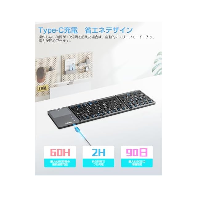 【長寿命バッテリー & Type-C充電】 このワイヤレス キーボードは内蔵バッテリーで最大約60時間連続使用・約90日間待機可能。この無線キーボードは付属Type-Cケーブルで簡単充電。このbluetoothキーボードは使用しない時は自動スリープ機能で省電力化。