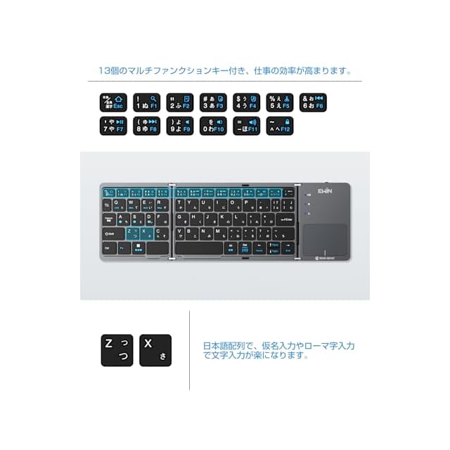 商品名:Ewin キーボード bluetooth 折りたたみ ワイヤレス タッチパッド付き keyboard 無線 日本語配列 ブルートゥース ios Android mac Windows対応 3台までのデバイスと接続可能 ipad iphone用 コンパクト 薄型 軽量 タブレット スマホ パソコン用 Type-C充電 スタンド付 グレー