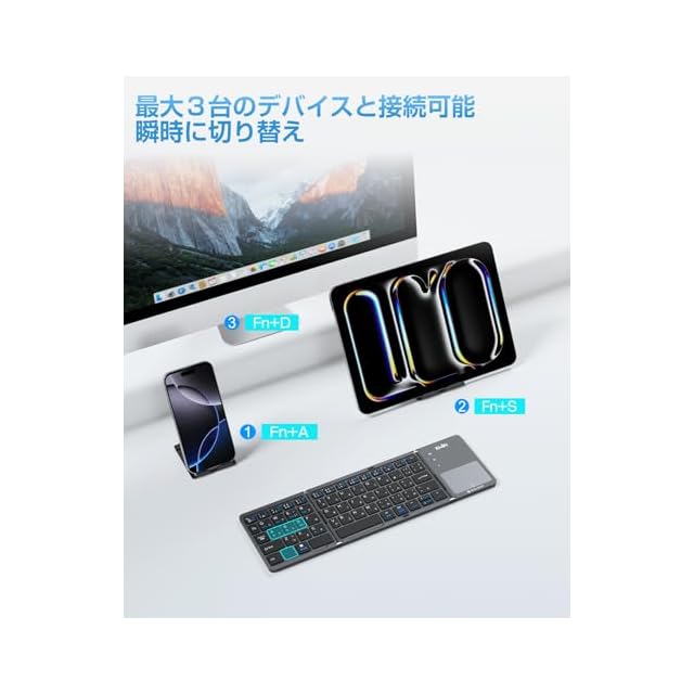 【最大3台接続可能 、自由に切替】 この折りたたみキーボードは最大3台の異なるデバイス(iphone ipad surfaceなど)とペアリング可能。この無線 キーボードは、Fn+A/S/Dの簡単操作で、3台スムーズに自由に切替。