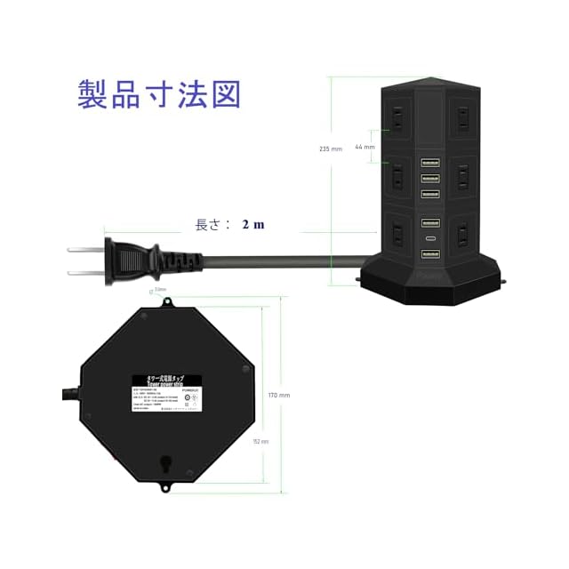 ■1,商品名; 1500wタワ電源タップusb付き<br> ■2,入力電圧; AC90-125V 50/60Hz 15A<br> ■3,Type-C USB出力電圧: 5V 3A,9V 1.5A, 12V 1.5A。 ■4,USB出力電圧; DC5V 2.4A x 5<br> ■5,AC電力出力; 1500W以下<br> ■6,定格周波数; 50/60Hz<br> ■7,防火ランク; 94V0 <br> ■8,材質:本体:ABS+PC樹脂、プラグ:PVC 差込口:ユリア樹脂<br> ■9,過負荷保護装置;1500w以下<br> ■10,商品サイズ; 約 高さ23 × 長さ14.1 ×幅14.1 CM<br> ■11,商品重量; 約650g<br> ■12,ケーブル長; 約2m<br>