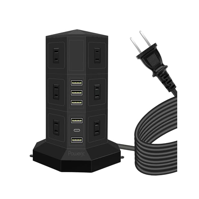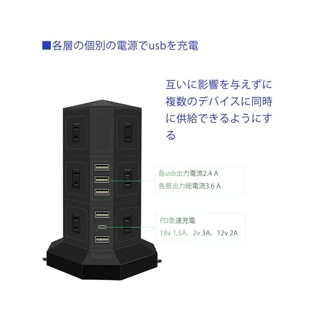 【3d設計】タワー式タップ、多角的なコンセント、使い胜手よりになります。PD Type-C付 USBポートと12つのACコンセントを搭載し、一度に複数の機器に給電、充電することが可能。デスクの上や家庭での使用に最適です。変圧機能がありません。