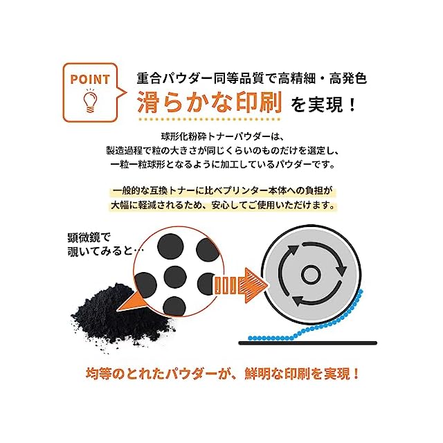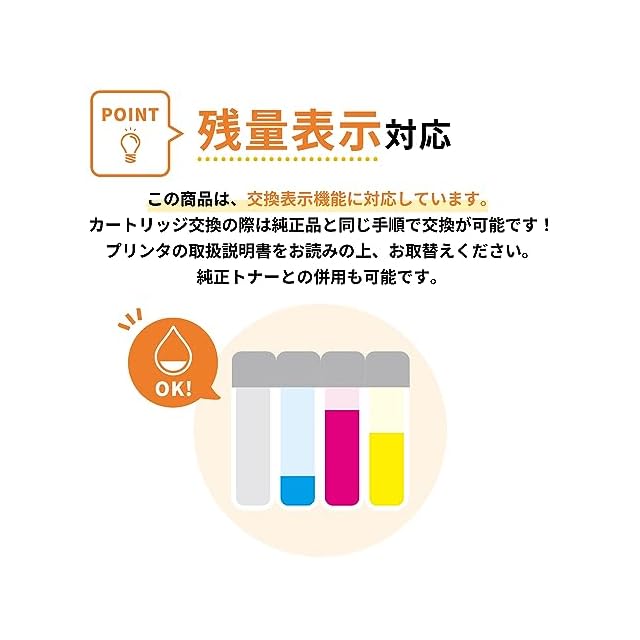 [商品説明] ・本製品は純正品と同様にご利用いただける互換トナーカートリッジです。メーカー純正品ではございません。 ・純正品と同様、カートリッジの両サイドについているギアにて認識・残量管理が可能です。 ・※トナーのギアがプリンターギアとかみ合って認識される仕様ですので、カートリッジを装着する際は、きっちりと奥まではめ込んでください。 ・カラ打ち防止のため、トナーパウダーは多めに入っており、使用後も若干残りますが異常ではありません。